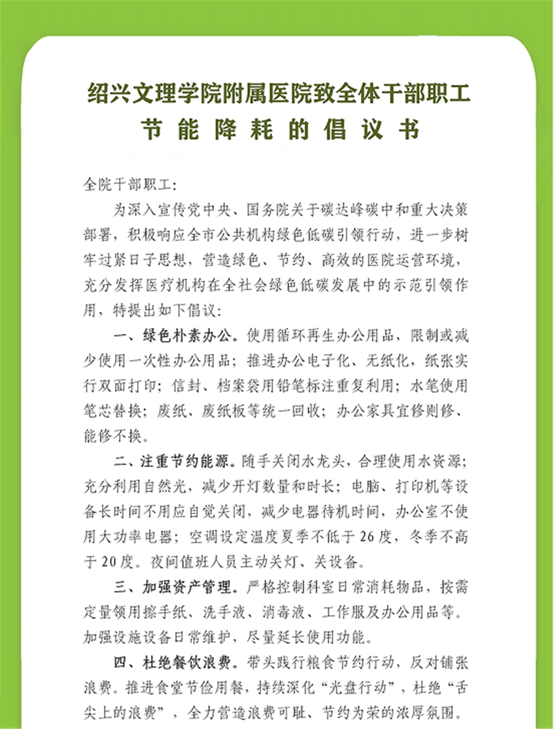 紹興文理學(xué)院附屬醫(yī)院致全體干部職工節(jié)能降耗的倡議書