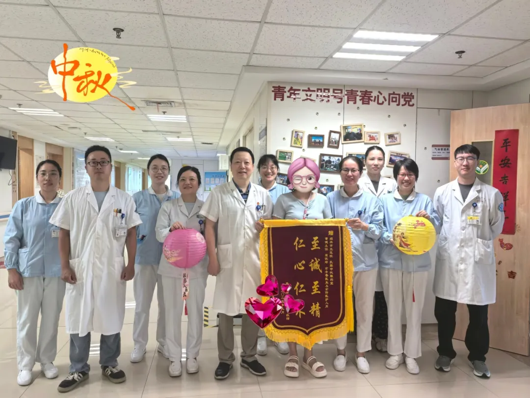 中秋前夕,乳腺、甲狀腺頭頸外科醫(yī)護(hù)人員親手把中秋燈籠掛滿病區(qū)角落。將月餅、水果與祝福送到患者手中。讓患者雖然少了親友相聚的時(shí)光,卻多了醫(yī)護(hù)共盼安康的溫情。出院患者也給病區(qū)送來了錦旗,讓整個(gè)病區(qū)縈繞著佳節(jié)的暖意。真是醫(yī)患一家親,情濃滿中秋。